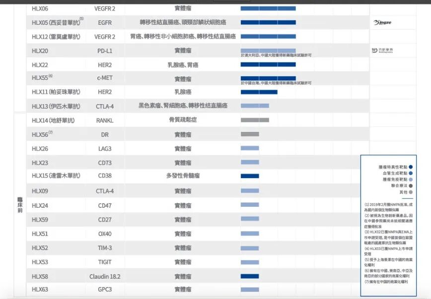 2019年研发投入14.06亿元人民币,同比增长44.66%;亏损8.76亿元人民币,主要是由于研发活动的扩大所致。 目前处于后期的产品线(pipeline): 曲妥珠单抗生物类似药(HLX02)和阿达木单抗生物类似药(HLX03)分别于2019年4月和1月在国内提交上市申请,目前均处于优先审评进程中。 贝伐珠单抗生物类似药(HLX04)的III期临床试验已经完成患者入组,正筹备就其转移性非鳞状非小细胞肺癌适应症、转移性结直肠癌适应症向国家药监局递交新药药证申请(NDA)。 抗PD-1单抗HLX10已相继获得美国、中国台湾和中国大陆的临床试验批准,并针对MSI-H/dMMR(高度微卫星不稳定性/错配修复缺陷)实体瘤和慢性乙型肝炎开展单药2期临床研究,有望凭借2期研究于2020年底/2021年初申报上市。以HLX10为核心,联合其他药物,在全球范围内启动多项临床试验,探索食管鳞癌、肺癌、肝癌、胃癌、宫颈癌及头颈鳞癌等多种实体瘤的治疗。 复宏汉霖HLX10差异化的“Combo+Global”开发战略 已陆续启动HLX07(抗EGFR单抗)、HLX20(抗PD-L1单抗)、HLX22(抗HER2单抗)和HLX55(抗c-MET单抗)等创新药物的临床试验,并加速推进管线中创新产品HLX26(抗LAG3单抗)和HLX23(抗CD73单抗)等在研产品的临床前开发进程。 最新早期产品线: 参考: NMPA/CDE; 药融圈数据,Pharnex Datamonitor; FDA/EMA; 相关公司公开披露; http://pdf.dfcfw.com/pdf/H2_AN202003231376836849_1.pdf等。